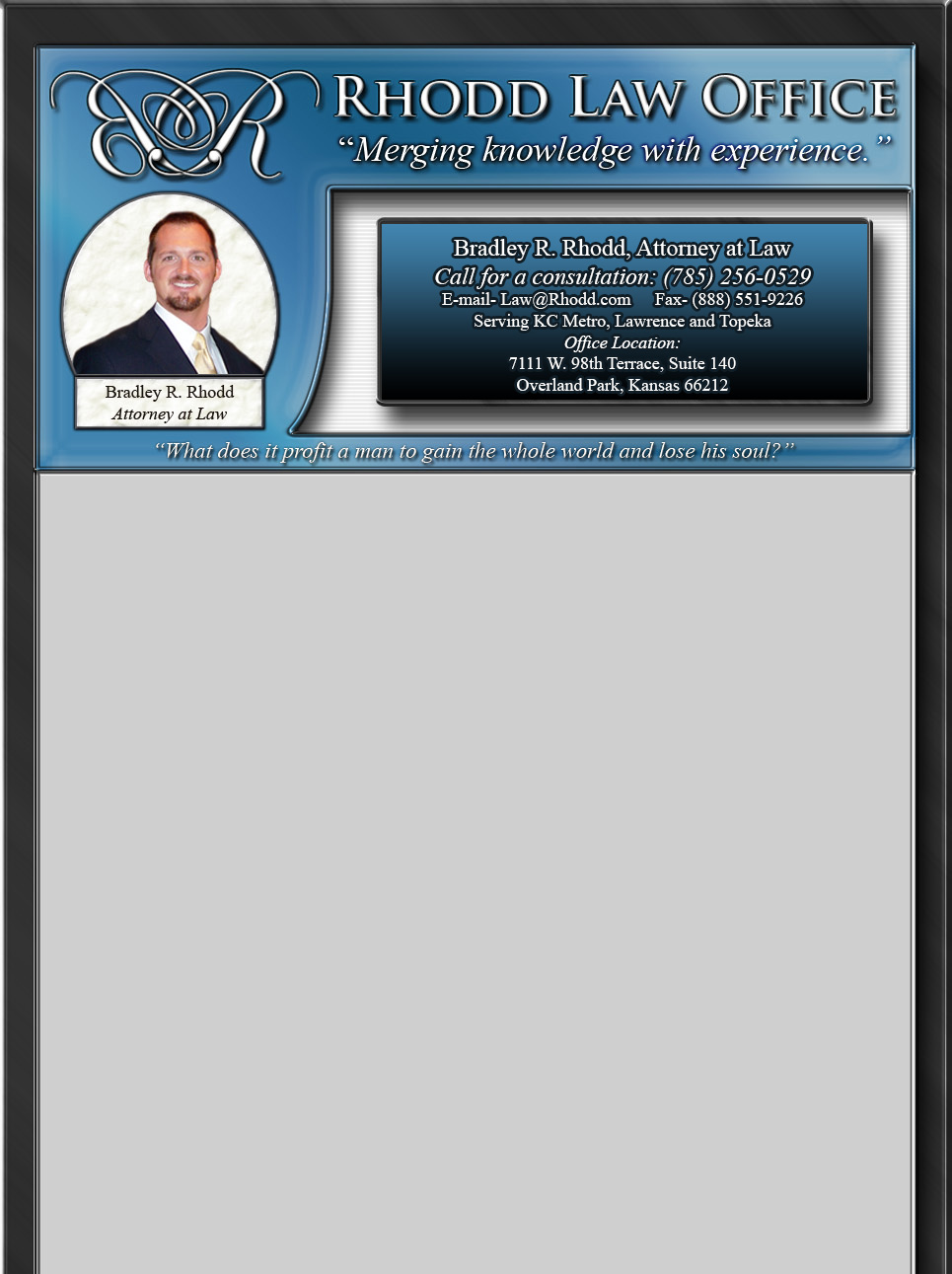 | Get the professionalism and client service you deserve. Call today to schedule a consultation. Contact Bradley Rhodd, Attorney at Law. Telephone- (785) 256-0529 Fax- (888) 551-9226 e-mail- law@rhodd.com |